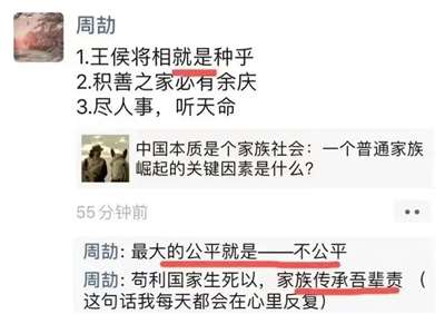 用那位朋友的话说,我的文章主旨是在绝对不公平中寻找相对公平,但周公子的读后感却成了,最大的公平就是不公平,还恬不知耻的说苟利国家生死以、家族传承吾辈责。
