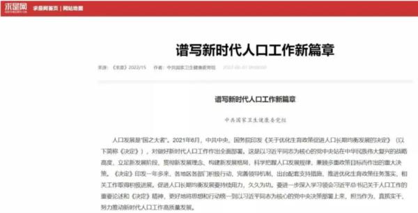 8月1日,中共中央机关刊物《求是》杂志,刊登了一篇名为《谱写新时代人口工作新篇章》的文章中提到这样一句话: