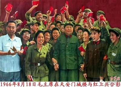1966年8月18日,首都天安门广场举行群众大会,毛主席在天安门第一次接见来自全国各地的群众和红小将。
