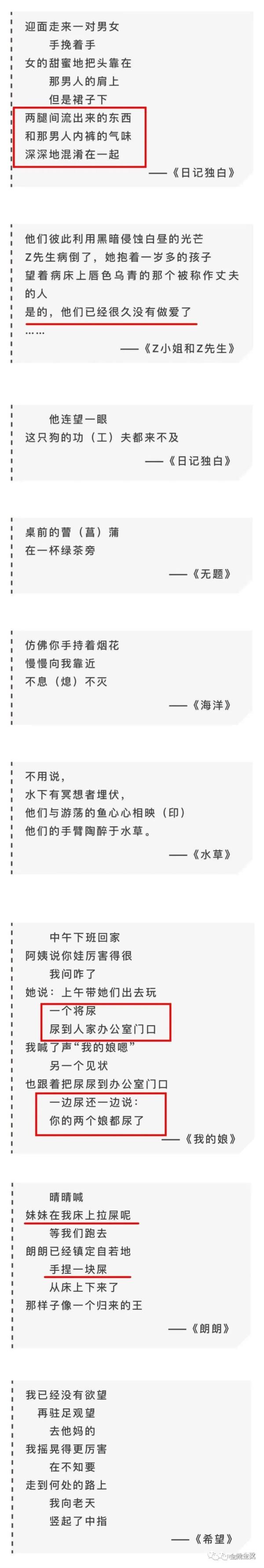 先来欣赏一番她公开刊登并受到体制内同侪一致叫好称道的“屎尿屁文学”: