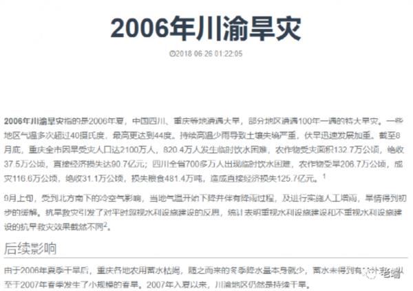 3,如果以上的例子还不够显著的话,2006-2007年四川发生了特大干旱,然后2008年就是汶川大地震。