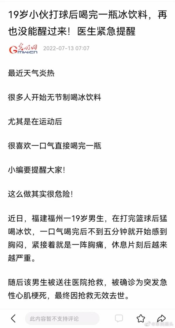 然而,目前有些人竟然以科普的名义称,只要当下没有出问题,只要当下没有感觉不舒服,那就放心喝冰水吧。