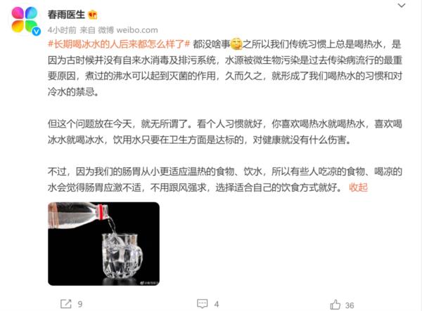 此种说法,当然与国内的传统习惯形成了反差——相比西方发达国家喝冰水凉水的习惯,国内喝开过的水、温水已经成为了一种习惯——引发热议也就毫不奇怪了。