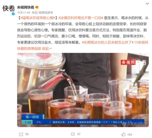 正如“央视网快看”今天发布的新题提到的,从很热环境到很冰环境,会导致心脏上冠状动脉的血管痉挛,长时间痉挛会导致心源性心梗。所以冰饮料不是高温作业或激烈运动后的首选,哪怕真要喝也得小口喝、慢慢喝。
