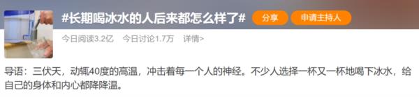 “手机上的新浪”昨天下午在微博上搞了个话题,“长期喝冰水的人后来都怎么样了”。截至刚刚,话题阅读次数3.3亿人次,讨论次数1.8万,其中阅读次数的3.2亿和讨论的1.7亿都是今天贡献的。
