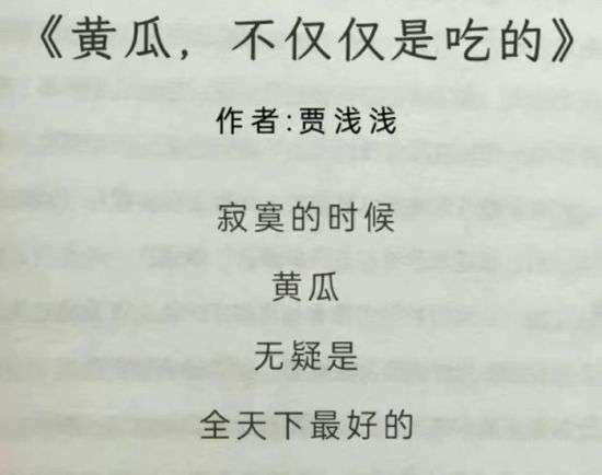 名门之后,却老是走下三路,是何道理?在文学作品中,屎尿屁,可不可以写?唐朝诗人王梵志就写过“本是屎尿袋,强将脂粉涂。凡人无所识,唤作一团花”。苏轼则有被嘲“八风吹不动,一屁打过江”之句,很明显都受到禅宗影响。嬉笑怒骂,放荡不羁,是文人本色。可是贾浅浅呢?是这样的吗?她的这些诗歌,读下来的感觉就是格调不高,亦谈不上什么诗意。 比如贾浅浅的《黄瓜,不仅仅是吃的》: