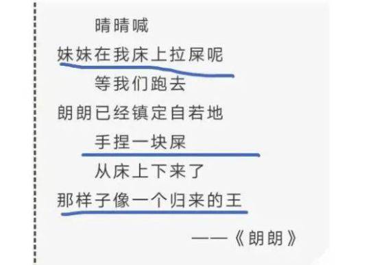 手上捏一块屎的朗朗像不像“一个归来的王”呢?天底下,有史以来哪位归来的王是手拿一块屎的呢?确实有点费思量。诗人的脑回路确实不同一般呢。 另一首《雪天》也是近期为众多网友“津津乐道”的一首诗: