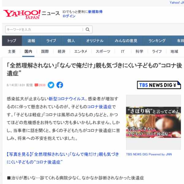 8月14日左右,日本Yahoo登了一篇TBS的新闻报道《“完全不被理解”,“为什么只有我”,父母也很难察觉的孩子的“新冠后遗症”》,这篇报道很快就登顶热搜,引起日本网友热议。