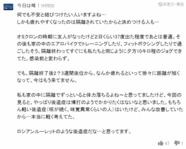 其中有一位讲,自己是在今年4月感染,到现在还一直有后遗症,最近味觉和嗅觉恢复了,但是还有倦怠感、低烧37度出头、注意力下降、突然喉咙不适和咳嗽、头脑运转力下降等等。他认为这绝不是普通的感冒,并希望新冠后遗症的治疗药能快点出来。