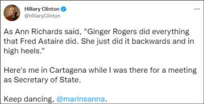 近日,芬兰总理桑娜·马林因“热舞视频”“官邸不雅照”陷入争议。8月29日,希拉里在推特上引用了一句流行语,声援马林让她“继续跳舞”,并附上了她自己早前跳舞的照片。马林很快就回文:“谢谢你,希拉里·克林顿。”