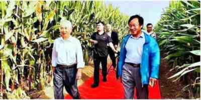 画面显示,戴景瑞等一众专家和官员,意气风发地走在玉米地的田间小路上,脚下踩的则是猩红的地毯。又长又宽的红地毯,几乎平平坦坦铺满了整条小路,阔步向前的专家、官员们完美的展示了中国社会主义新农村迈入小康后的繁荣景象。