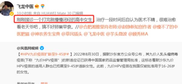 中医博主飞龙老师在昨天HPV九价疫苗扩龄的热搜下,讲述了自己接诊的一例接种HPV疫苗副作用的病例。一名高中女生,接种完就慢慢闭经了,这种情况搞不好就是卵巢早衰。而以飞龙老师的高超医术都表示很难治愈,这就让人无比唏嘘了。