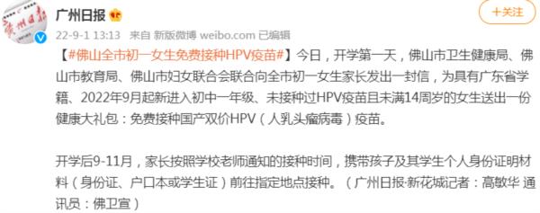 今天是开学第一天,据广州日报消息,今天佛山市为具有广东省学籍、2022年9月起新进入初中一年级、未接种过HPV疫苗且未满14周岁的女生免费接种国产双价HPV(人乳头瘤病毒)疫苗。