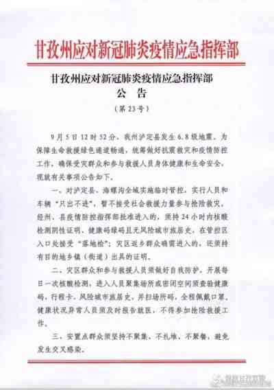 地震当天,甘孜州应对yi.情应急指挥部发出公告,对统筹抗震救灾与yi.情防控工作做出公告。