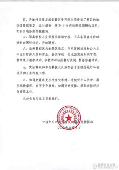 公告如下图所示,简言之就是暂不接受社会救援力量参与救援,进入救援需经批准且持24小时核酸阴性证明无风险城市旅居史;灾区群众和救援人员都需要进行每日一次核酸检测;要做好环境消杀和卫生防.yi工作;如遇地震或次生灾害,请做好个人防护,服从现场指挥,有序安全撤离。