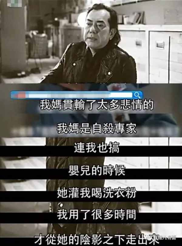 黄秋生还说,"我妈是自杀专家,连我都搞,在婴儿的时候,给我灌过洗衣粉。"