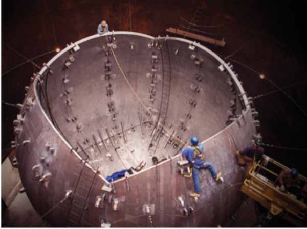 目前世界上最大的激光聚变装置是美国的国家点火装置(NIF),装置的核心是一个直径达10米,重13吨的钢球靶室。燃料靶丸被放在靶室的中央,等待功率高达5千亿千瓦(5 *1014 W)的激光的轰击。