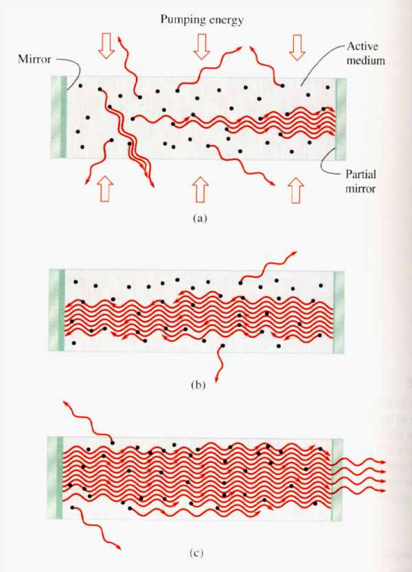 这个空腔被称为谐振腔,它由两块平行放置的平面镜组成,其中一个是全反射镜,可将光完全反射;另一个是允许小部分光通过的部分反射镜。