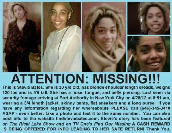 斯蒂夫·贝茨当时就读于纽约市立大学亨特学院。她最后一次被人看到是在2012年4月12日早上8时,当时她正离开位于布鲁克林皇冠高地斯特林广场的姐姐家。她最后一次被监控摄像头拍到是在2012年4月28日,纽约港务局巴士终点站的一个监控摄像头拍到了她。