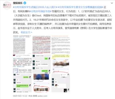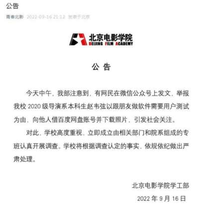 9月中旬,有网友爆料,北京电影学院导演系2020级学生赵韦弦以“软件测试”为由,向众多女生索要私人网盘账号,并私自查看下载对方的私人照片。不仅如此,他还在19年到21年期间以“作业拍摄”为名要求女生穿泳装、超短裤等录视频,录制女生“沉重的喘息声”,并半夜骚扰女生,要求对方拍裸照。