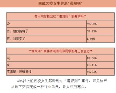 2008年,有门户网站对艺术院校女生进行不记名调查,结果有超过40%的女生表示自己碰到过“潜规则”事件。