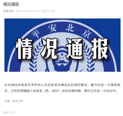 针对网民举报某艺考机构人员杜某某涉嫌违法犯罪的情况,警方经进一步调查取证,已将犯罪嫌疑人杜某某(男,40岁)依法刑事拘留,案件正在进一步侦办中。
