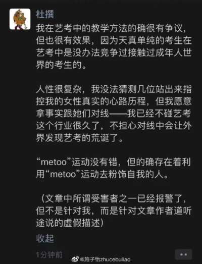而在前一次回应中,杜英哲表示自己的教学方法确实很有争议,但也很有效果:“我在艺考中的教学方法的确很有争议,但也很有效果,因为天真单纯的考生在艺考中是没办法竞争过接触过成年人世界的考生的。”