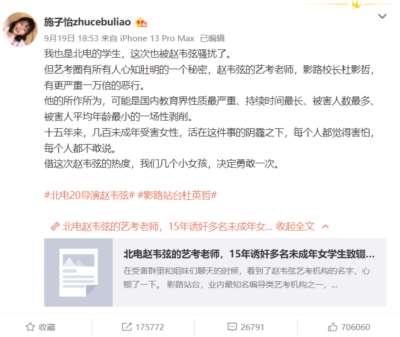 博主@施子怡zhucebuliao表示,自己也被赵韦弦骚扰过,但是“赵韦弦的艺考老师,影路校长杜影(英)哲,有更严重一万倍的恶行。”按照施子怡的描述,杜英哲在15年时间里利用职务之便,性侵、性骚扰多位女学生、女员工,其中不少还是未成年人,并表示这“可能是国内教育界性质最严重、持续时间最长、被害人数最多、被害人平均年龄最小的一场性剥削。”