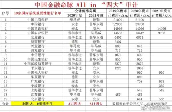 如果他们要站出来解释,自己专业能力有限,那么请问:既然他们的专业能力不行,我们为什么还要把事关中国金融命脉的19家系统重要性银行清一色交给四大洋会计师事务所审计呢?
