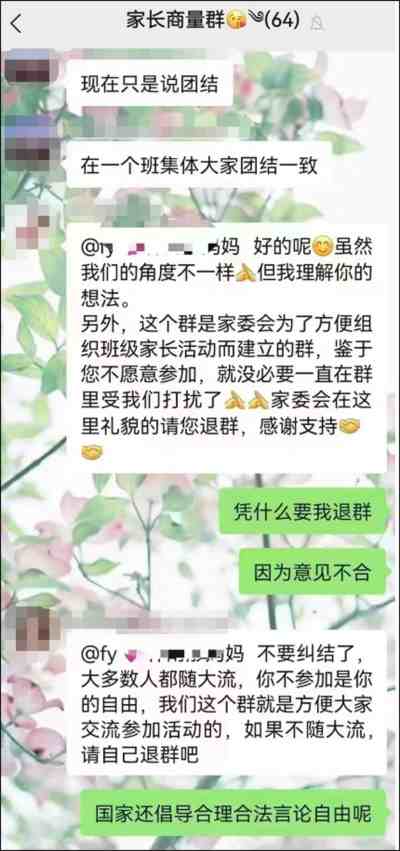 在当事家长对退群要求提出质疑后,另一位家长更是义正言辞表示,“不要纠结了,大多数人都随大流,你不参加是你的自由,我们这个群就是方便大家交流参加活动的,如果不随大流,请自己退群吧。”