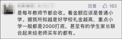 还有说初中学生家长每年要给5个任课老师送两回礼,每次每位2000到5000不等,光一年送礼金就2万打底,这还没算上送其他礼物的费用。