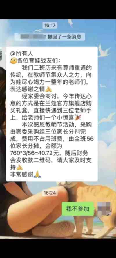 9月4日,广西柳州某班级家长群里,以家委会名义发布的一则信息称,该班“历来有尊师重道的传统”,为“表达感谢之情”,决定购买兰蔻礼盒,不占用班费而由56位家长分摊。