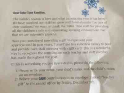 在美国幼儿园里,老师不仅公开收礼,而且还有“收礼季”这一说。在有些幼儿园和学校,家长还会收到号召家长给老师送礼的信件,甚至公然提议给老师送礼品卡和现金。更有甚者,一些老师会直接告诉孩子和家长他们希望得到什么样的礼物。