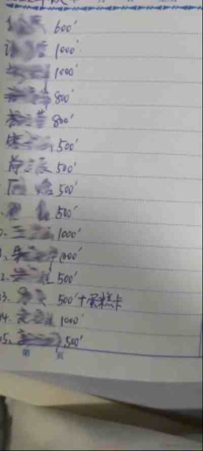 在这张被误发的照片里,一共写了15个人的名字,每个名字后面都附有金额,数量在500到1000元不等,其中一条后面还写着“+蛋糕卡”。