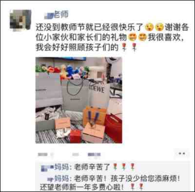 2019年某幼儿园老师晒的朋友圈里,各大国际名牌奢侈品礼物更是在教师节堆满了桌子,有家长反映孩子用心给这位老师做的手工花在老师的朋友圈丝毫不见踪影,应该是老师觉得“不上档次”。