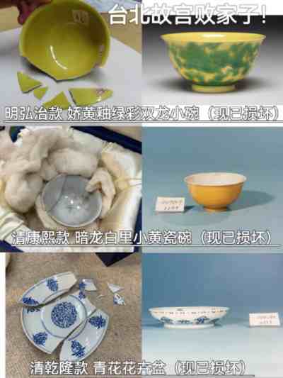 台北故宫博物院表示,2021年2月3日、2022年4月7日分别发现“明 弘治款 娇黄绿彩双龙小碗”、“清 康熙款 暗龙白里小黄瓷碗”破损。2022年5月19日“清 乾隆 青花花卉盘”掉落破损。见下图: