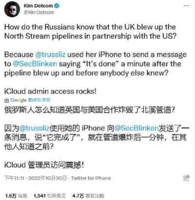 原因说出来无比简单,因为英国前首相特拉斯的私人手机被黑客给攻破了,黑客监听她的手机后发现,北溪管道爆炸才一分钟之后,特拉斯就给美国国务卿布林肯发信息:“搞定了(It's done)。”
