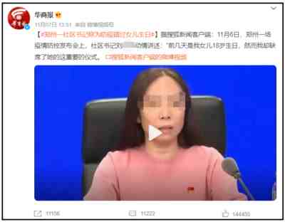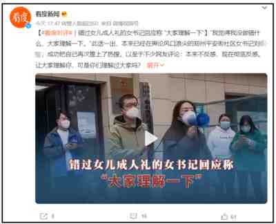 第一件是某社区书记在疫情防控发布会上,以自己错过女儿成人礼来表明基层工作的辛苦。