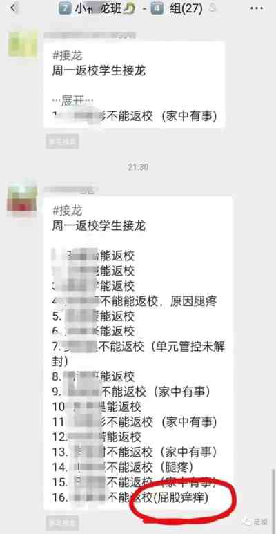 有趣的是,国际庄的防疫新政公布之后,老百姓的反应有点令人出乎意料。明明学校开放返校了,但是家长们纷纷以各种借口给孩子请假不去。牙痛、手痛、脚痛,连屁股痒都冒出来了。