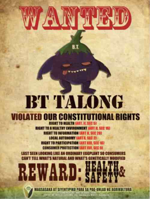 转基因茄子面临着来自民间社会、农民、环保主义者和种子保护团体的强烈反对。为了开发Bt茄子,据说Mahyco和孟山都获得了九个本土茄子品种的知识产权。但是,所有这一切都没有告知农民或公众[37]。由于这些基因改造过程和专利,孟加拉国农民将失去对其本土茄子品种的控制[38]。