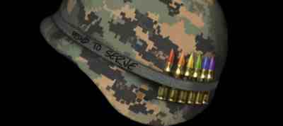 按照常识,军营之中展示的旗帜,要么是国旗,要么是军旗,怎么现在优先展示的是“彩虹旗”?且传统军事元素符号:头盔、子弹,同样无时无刻不在灌输LGBT跨性别概念。如下:
