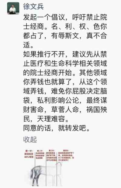 所以有人就发出倡议,禁止院士经商,特别是禁止医疗和生命科学相关领域的院士经商。因为医疗和生命科学领域不但关系着老百姓的钱包,还关系着老百姓的生命,如果把赚钱放在第一位,老百姓不生病了怎么赚钱?病毒都消灭了怎么赚钱?