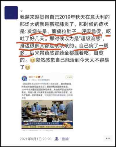 前文中我提到——“我可能重复感染了新冠”,之所以这么说,是因为三年前的2019年秋冬,我在欧洲的意大利,在一场席卷欧美的“超级流感”中,有过类似的症状。2021年的时候,我曾在朋友圈里回忆过此事:发烧头晕、腹痛拉肚子、呼吸急促。