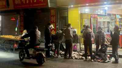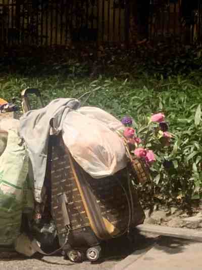 等慢慢蹚出村子后才发现已经走到了客村。一位老人裹着漏风的棉袄蜷缩在路边,胳膊搭在膝盖上,头埋在里面,身子两旁并排着塞满布条的麻袋,还有个拉杆箱,上面插着几束粉色和紫色的塑料花,正随风轻晃。