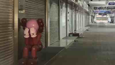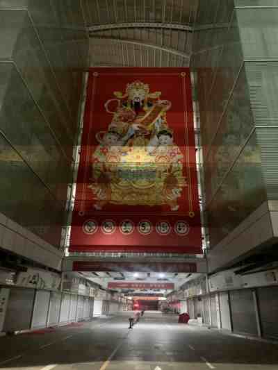 入口还明显残存着前阵子封控时遗留的痕迹,铁栏、水马、三角架、雪糕筒随处可见。街道空空荡荡,灯光拍在身上,影子被扯得如同鬼魄,孤零零地在惨白的地面飘荡。无意瞥见楼栋间的巨幅年画,却冷不丁打了个寒颤。