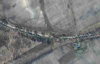 这是美国方面曝光的几张卫星照片,黄色的土地、绿色的树木、灰色的公路,而且还可以很清晰地看到俄军的车队。