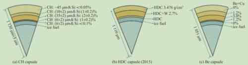 燃料靶丸具有多层结构,由多种材料组成。在目前较为成熟的设计里,构成靶丸外层的材料主要是碳氢(CH)、高密度碳(HDC)或者铍(Be)。内部则是等待发生聚变反应的氘、氚。