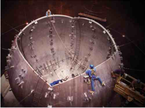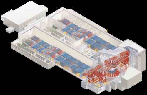 美国的NIF就是这么一条路线,它的占地面积约有三个标准足球场大小,在如此大的室内空间里,排布着192条管道线。这些管线最终汇聚于一个直径10米,重13吨的钢制空心球体内中。