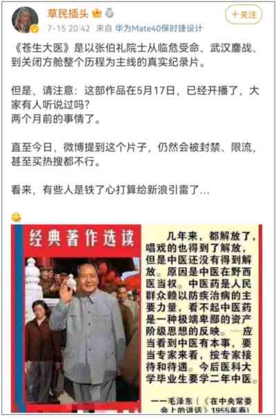 《苍生大医》还并非央视荧幕首映,早在两个月前,它就已经在天津卫视播放了;但由于微博热搜和抖音推荐的限制,极少有人注意到;即使在中医圈内,也没有广为流传。