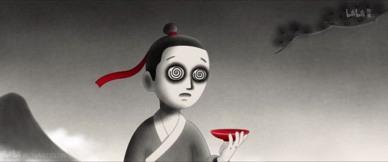 原本酒是什么?是五谷之精华,是纯酿美好的,可是影片里我们看到狐狸倒出的酒的画面是什么?是黑暗、眩晕和诡异的画面,令人迷乱和麻痹。影片里有一幕货郎在此时乘着小船在酒精的海洋里,迷失的冲下了万丈深渊的画面,同样是在说明这里的酒精是控制货郎的另一种手段,是搞意识形态统治的。货郎在饮酒之后,眼圈里立刻出现跟狐狸倒给他的酒一样的眩晕、黑暗、诡异的一幕,这再一次说明了我们的猜测是合理的。这里的酒就是控制意识形态的,酒本身也有麻痹人的作用,更何况带着黑暗、眩晕画面的酒了。